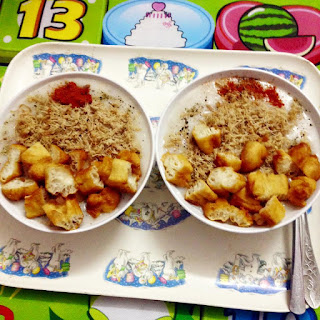 – Múc cháo ra bát, thêm ruốc, quẩy và ớt bột, hạt tiêu.