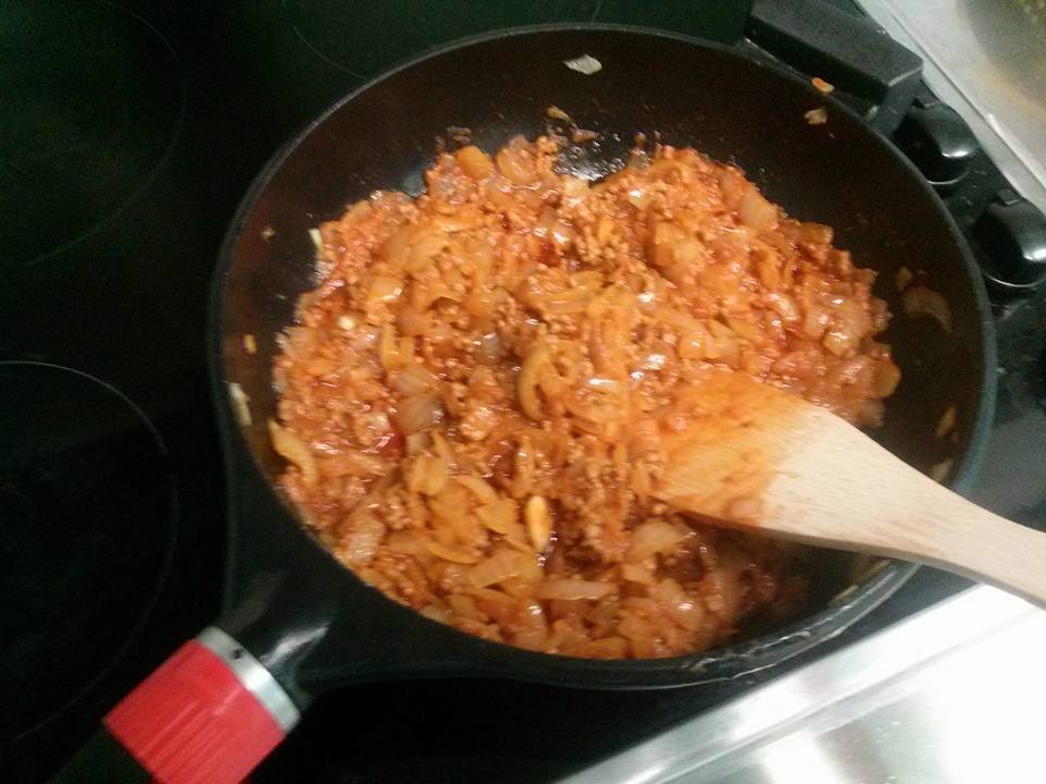 – Sau khi hành tây mềm mới cho thịt bò xây vào đảo và cho sốt cà chua vào (nếu các bạn dùng cà chua trái thì băm nhuyển rồi cho vào chảo đảo để ra sốt hen). tiếp tục để lửa liu riu cho đến khi được một hỗn hợp sệt. Nhân nên làm sệt một chút vì khi nướng sẽ không bị chảy tùm lum.