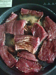 – Thịt bò mua về rửa sạch bằng nước muối loãng, ra khổ vừa ăn.